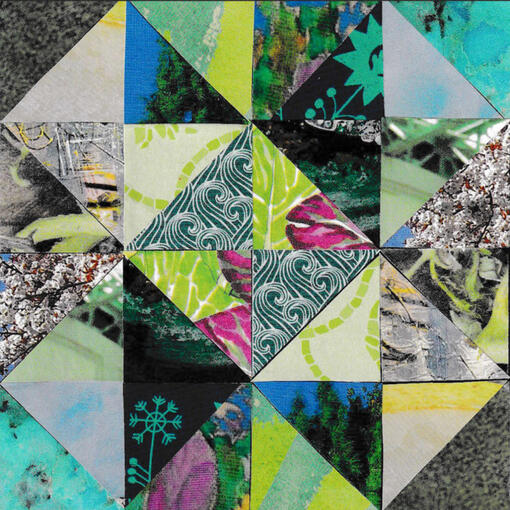"Cathartic Rhythms"Mixed media collage. Currently on display and for sale at Nevada Fine Arts 4x4 show.2026